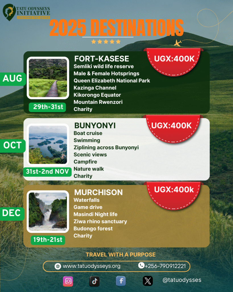 When you join Tatu Odysseys, you’re not just visiting Uganda, you’re becoming part of a charitable travel community in Uganda that: Empowers local families and schools, Creates opportunities for women and youth, Protects natural and cultural heritage and Ensures tourism directly benefits communities.